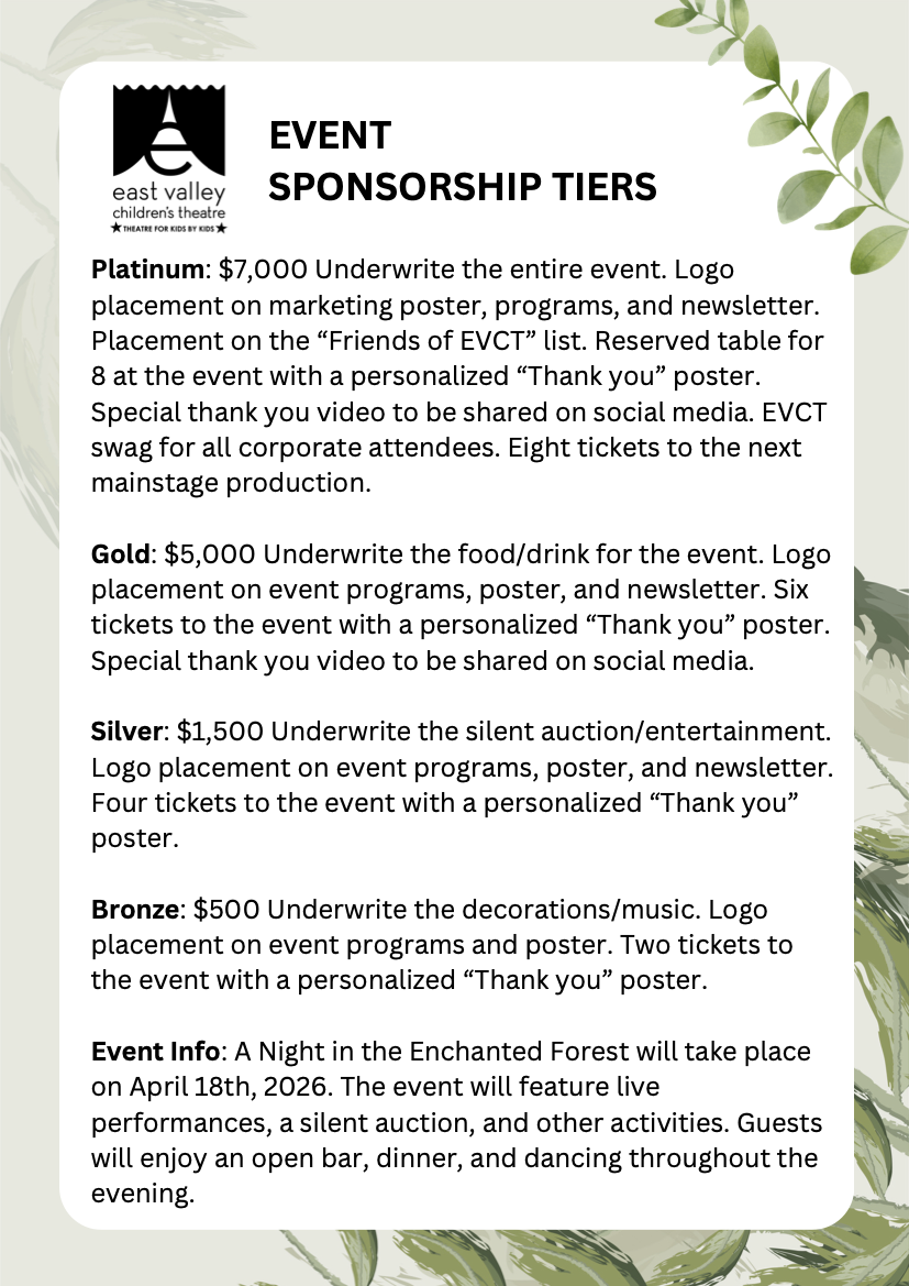 The EVCT Spring Gala is our biggest fundraising event of the year, designed for the entire family. Whether this is your first year or you've been before, your attendance plays a significant role in shaping our upcoming 2026-27 season.